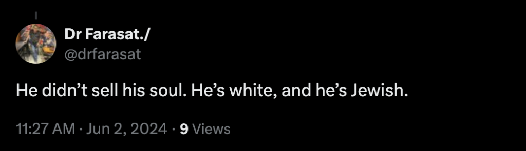 Speaking of Ukrainian President Zelensky, Ashraf wrote, “He didn’t sell his soul. He’s white, and he’s Jewish.”